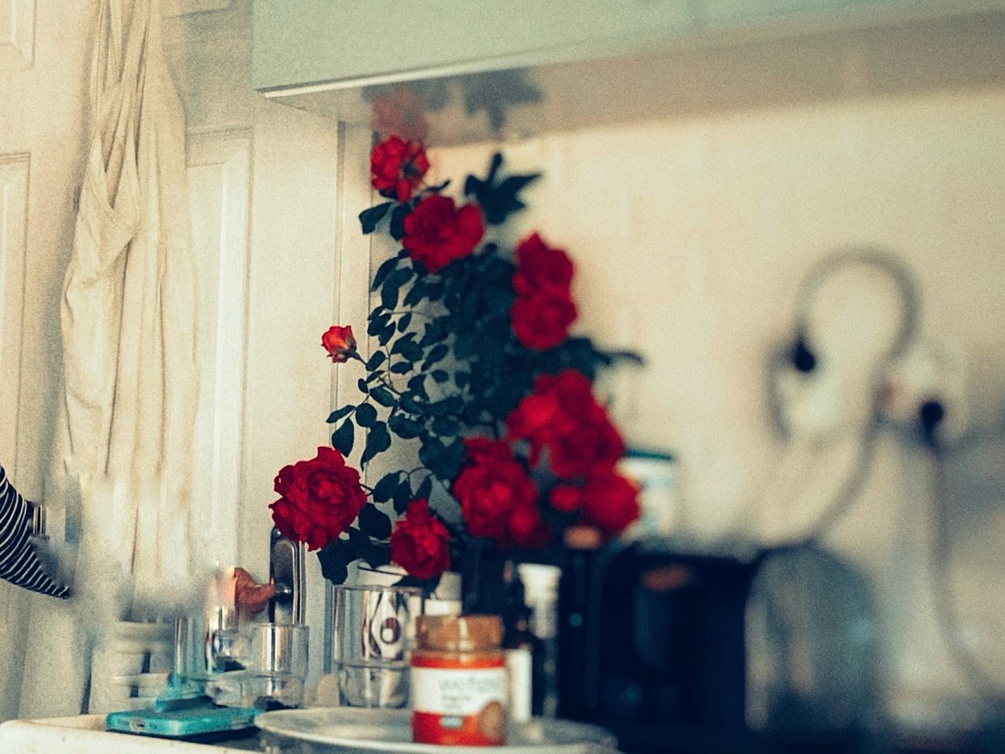 Fuchsia colored roses sit on the counter. She confessed to stealing them from the neighbors and I took a picture of her with the vibrant petals in the background, and I didn’t even make her pose because it was just so her. So my mother.